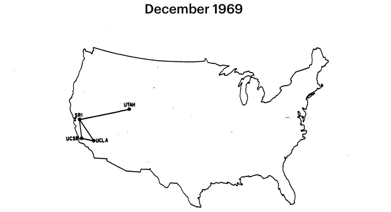 By 1969, computer nodes connected the Stanford Research Institute, UCLA, UCSB and the University of Utah—developed by the Defense Department’s Advanced Research Project Agency (ARPA).